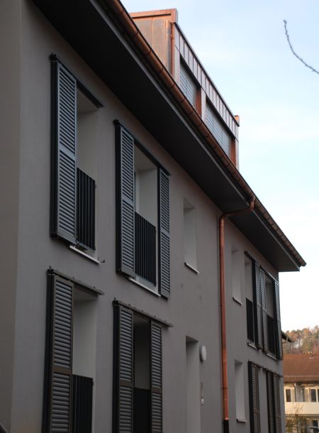 In mehreren Bauabschnitten wurden die zwei Gebäude aus den 50er Jahren saniert. Es sind drei zusätzliche Wohnungen entstanden. Durch das Zurückschneiden der Brüstungen bei den Fenstern haben die Mieter wesentlich mehr Wohnqualität erhalten.